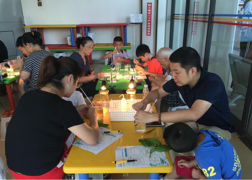 活動分為“植物白天都干了啥”、“葉片怎么浮起來了”、“事情沒你想象的這么簡單”三個環(huán)節(jié)。首先,在“植物白天都干了啥”的探究中,科技輔導(dǎo)員提出“什么是光合作用”作為開場,吸引了孩子們的好奇心進(jìn)入到活動中。隨后,親子家庭和科技輔導(dǎo)員一起動手做實驗,并在等待實驗結(jié)果過程中認(rèn)識了什么是光合作用、產(chǎn)生光合作用需要的條件和產(chǎn)物,以及涉及到的物理、化學(xué)等知識,結(jié)合實驗結(jié)果加深對光合作用的理解。在實驗過程中遇到困難時,在場的家庭們也都一起討論,共同解決。最后,在科技輔導(dǎo)員的帶領(lǐng)下,他們不僅認(rèn)識了光合作用對于人類生存和發(fā)展的重要性,還增強了孩子們保護大自然的意識。
