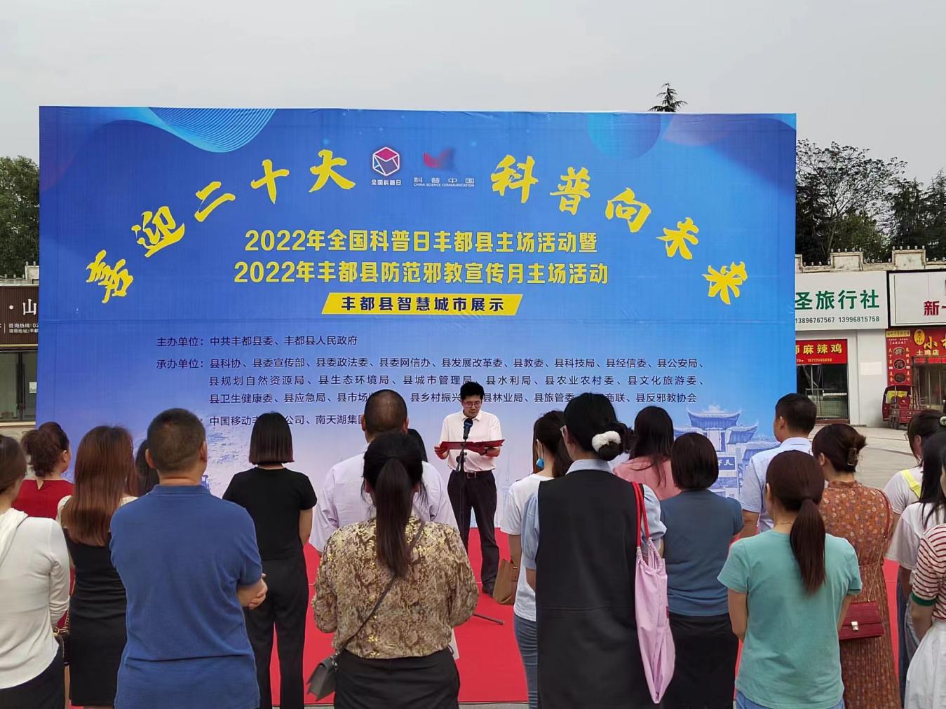 9月15日,豐都縣2022年“喜迎二十大·科普向未來”全國科普日主場活動暨豐都縣防范邪教宣傳月、智慧城市展示活動在朝華公園廣場隆重舉行。縣委常委、縣政府副縣長方紹飛出席活動并致辭。活動由豐都縣委、縣政府主辦,縣科協(xié)、縣委宣傳部等19家單位承辦、38家單位參與。