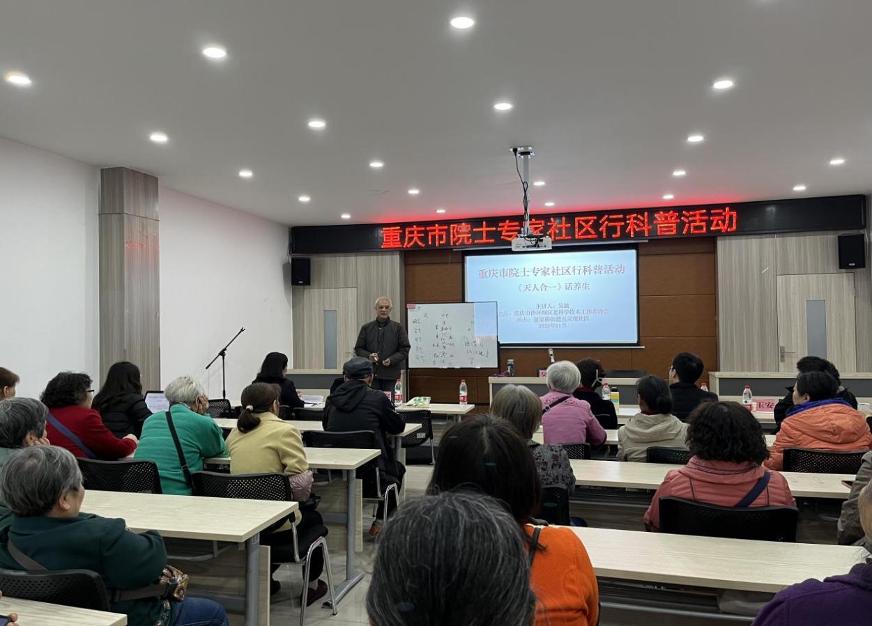 11月29日,沙坪壩區(qū)科協(xié)聯(lián)合老科協(xié)邀請著名國學(xué)家、全國勞動模范、區(qū)老科協(xié)教育衛(wèi)生專委會主任吳波為童家橋五靈觀社區(qū)居民講授了一堂主題為“《天人合一》話養(yǎng)生”的科普講座,近100名居民參加本次活動。